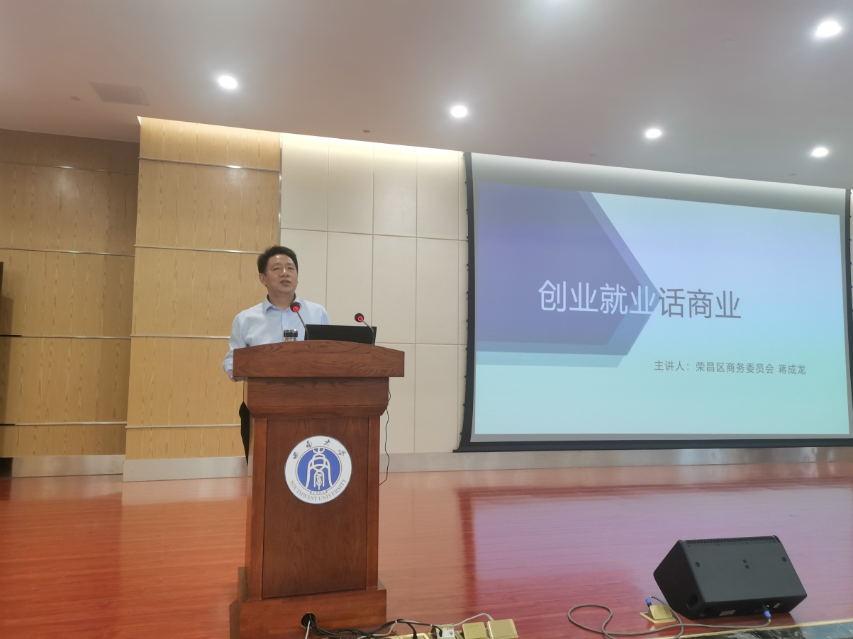 蒋成龙书记就荣昌区商业现状分析、荣昌区商业未来发展规划、老员工创业就业思路等内容展开,他指出,荣昌区当下按照“一区两圈、一圈多街、一圈一特色、一街一风格”工作思路,抢抓成渝地区双城经济圈建设重大战略机遇,有着前所未有的发展契机;并通过分享创业成功个人、先进企业等案例,鼓励当代老员工勇于创新、积极创业,希望k1体育学子以发展眼光看荣昌区商业机遇,并欢迎学子们扎根荣昌,创业发展;最后,他讲到“创业即就业”,就业创业更是探索人生价值的重要方式,地方政府与高校之间应加强合作,共促发展,探索有效的人才激励机制,实现人才就业创业的多元化、本土化。