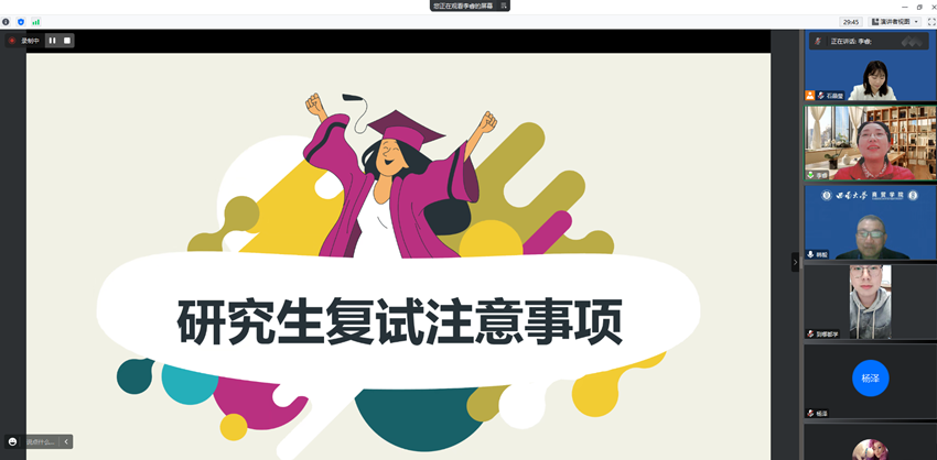 李睿教授对通过2023年研究生入学考试初试的同学表示衷心祝贺。她长期主持和参与研究生招生工作,根据历年招生经验,李睿教授详细地向同学们介绍了复试常见流程和备考过程中的注意事项,鼓励同学们树立信心,全心备考,在复试中发挥最好水平。在答疑互动环节,同学们纷纷就跨专业考研复试、复试面试技巧、专业成绩提升等方面提出了问题和疑惑,李睿教授均一一耐心解答,有针对性地为同学们提供备考建议。