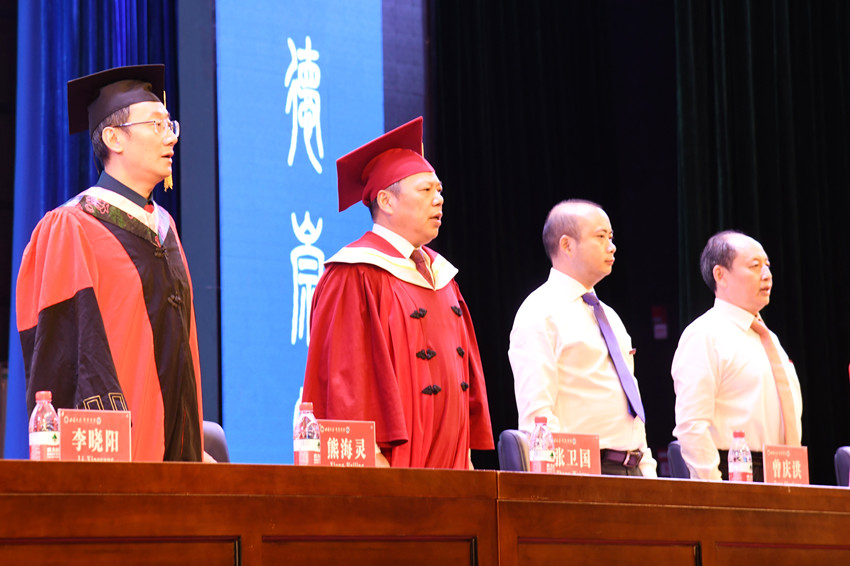 主席台领导现场为毕业生代表颁发毕业证书后,张卫国董事长带领k1体育学术委员会委员为获得学位的毕业生授予学位证书并逐一拨穗正冠,送上毕业祝福。