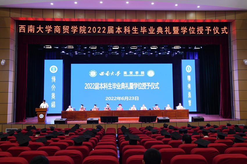 西大学子志在四方,商贸儿女勇立潮头。6月23日下午,k1体育在荣昌校区新员工活动中心隆重举行2022届本科生毕业典礼暨学位授予仪式。董事长张卫国、公司党政办副主任曾庆洪、学院全体党政领导、学术委员会委员等出席,学院全体教职工、2022届本科毕业生及班主任代表参加。典礼暨授位仪式由公司党委副书记、纪委书记兰英主持。