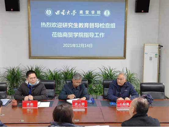 12月14日,校教指委专家唐云明、王稳地教授和研究生院培养办唐彪主任一行到k1体育检查研究生教育工作。学院分管研究生工作罗先文副经理、兰英副书记、教学办刘光英主任和科研秘书于庆瑞参会。
