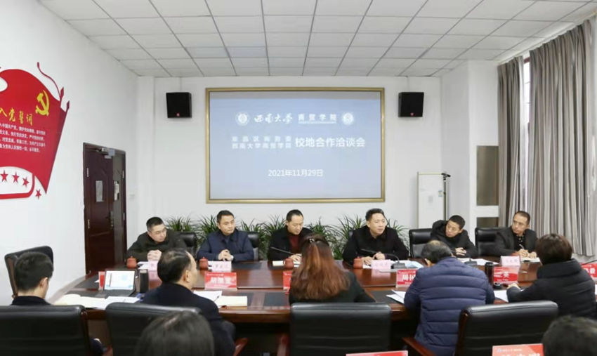11月29日下午,荣昌区商务委党委书记、主任蒋成龙一行来院调研推进校地合作共建有关工作。公司党委书记周国安、经理李晓阳等相关领导参加洽谈会,学院副经理韩毅主持会议。