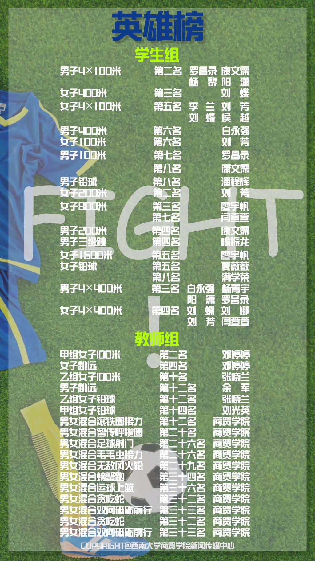学经理期以来高度重视体育工作,围绕“青春健身计划”常态化开展一系列体育文化活动,强体健心,全面发展,提升人才培养质量。在本次校运会中,全院师生运动员踊跃参与,展现了积极上进、乐观进取、奋力拼搏的商贸风采!