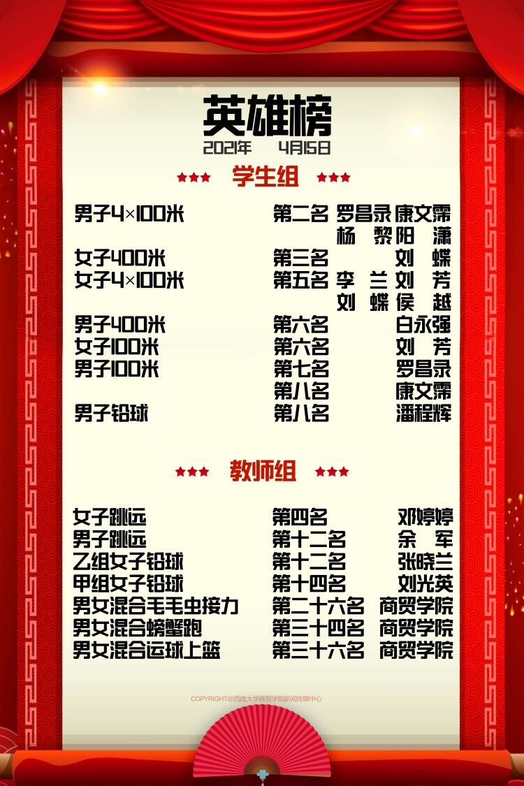 欢呼携手怡偿愿,续写青春再赋吟。员工代表队在15日赛场上挑战极限,超越自我,同样取得了优异成绩。19市营5罗昌录、18公管1杨黎、18信管1康文霈、18计科3阳潇等四人团结一致,夺得男子4×100米亚军;18市营3刘蝶、19公管1侯越、20市营5刘芳、19市营2李兰等四人同力协契,获得女子4×100米第五名;在女子400米比赛中,18市营3刘蝶斩获季军,19市营10白永强在男子400米比赛中夺得第六名;20市营5刘芳获得女子100米第六名;19市营5罗昌录和18信管1康文霈在男子100米分别获得第七名、第八名;在男子铅球比赛中,20市营9潘程辉获得第八名。