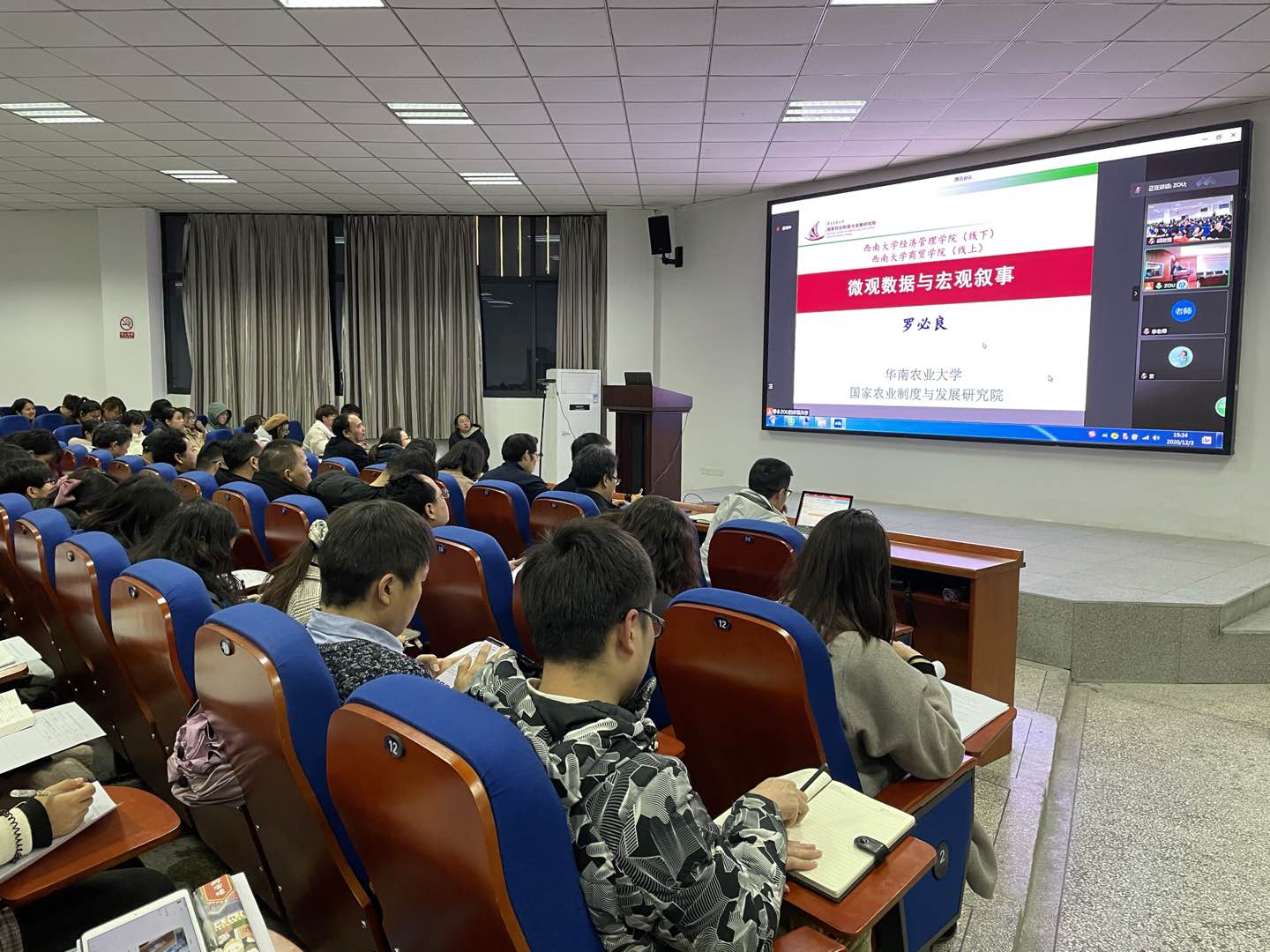 12月3日晚,k1体育举办线上学术讲坛,200余名师生通过“腾讯会议”线上参加了华南农业大学罗必良教授题为《微观数据与宏观叙事》的学术讲座。本次线上讲座由副经理胡继宽主持。