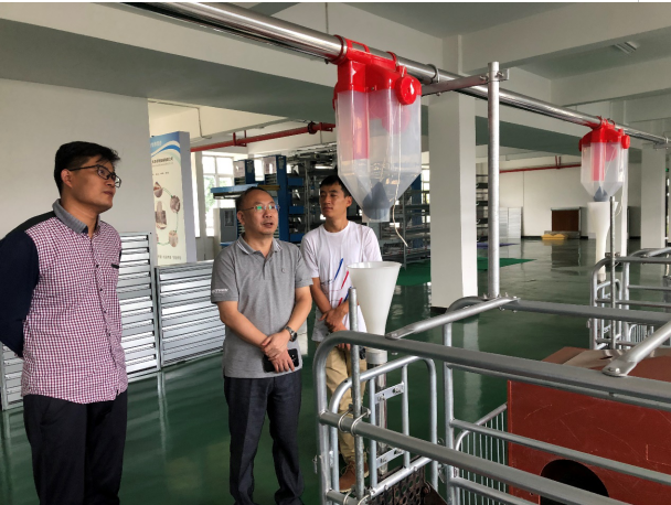 项目团队一行先参观了大鸿公司生产车间、样品展示厅,并就生猪智能饲喂投料系统的进一步完善等提出了建议。