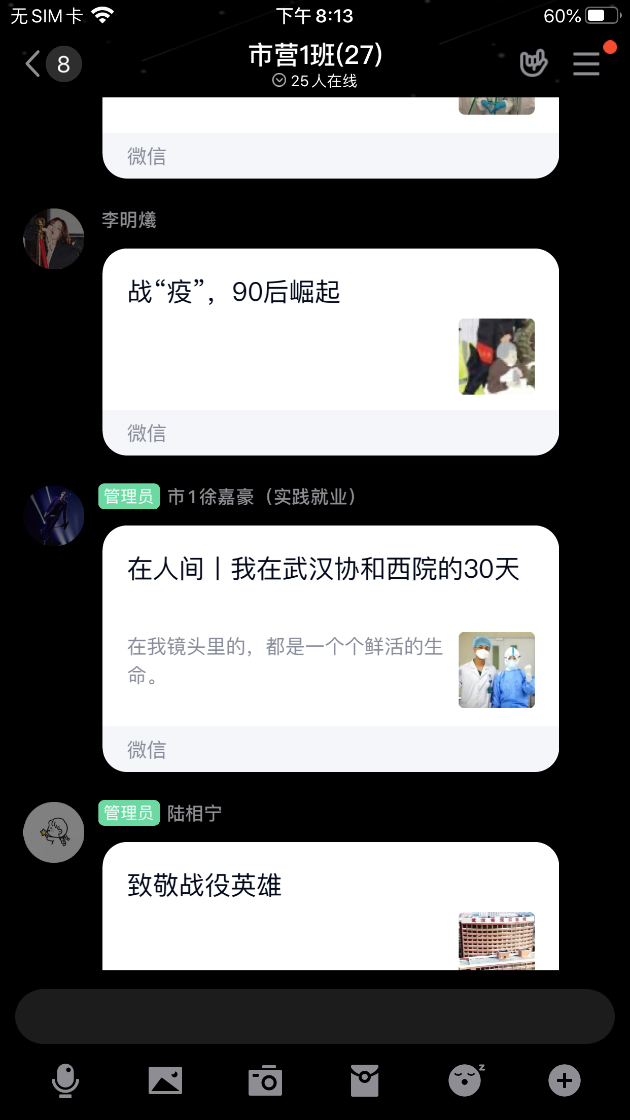 18市营1班同学学习并在班群中分享抗“疫”先进事迹。90后、00后在战“疫”中崛起,非典时的懵懂孩童和汶川地震时的青春年少如今成长为国家的希望,在疫情中用行动证明了自己的责任和担当。