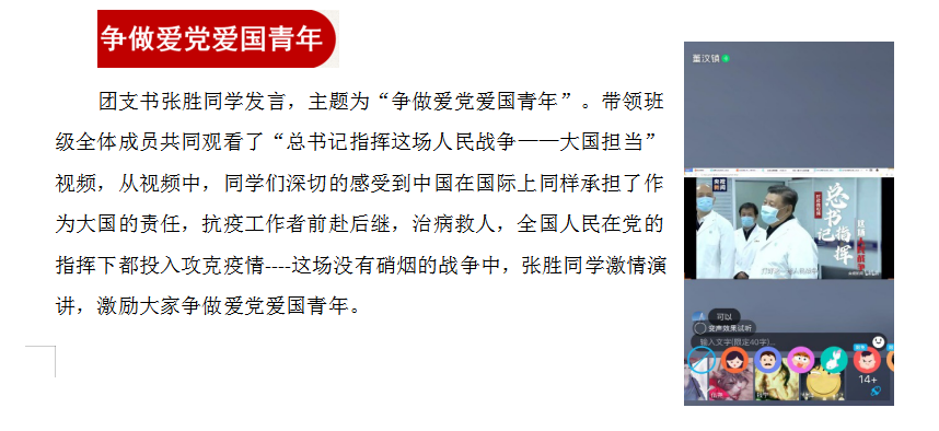 为深入贯彻落实习近平总书记关于打赢疫情防控阻击战重要指示精神,保障防控疫情期间“停课不停学”,各班主任提前做好了此次“云班会”的精心策划,按照各年级工作实际,凝练专业特色,创新班会形式。在班会上引导所有同学参与,充分挖掘当前的育人元素,激发了广老员工的爱国主义热情,增强了民族自豪感和自信心,引导广老员工众志成城,共抗疫情。