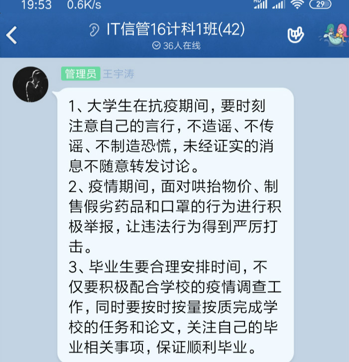 17信管2班班主任老师通过网络与同学们见面,了解同学们的居家防控状态和现线上学习状态,向同学们传达学校和学院的疫情防控举措,向大家强调务必做好防护,配合学校防疫措施。