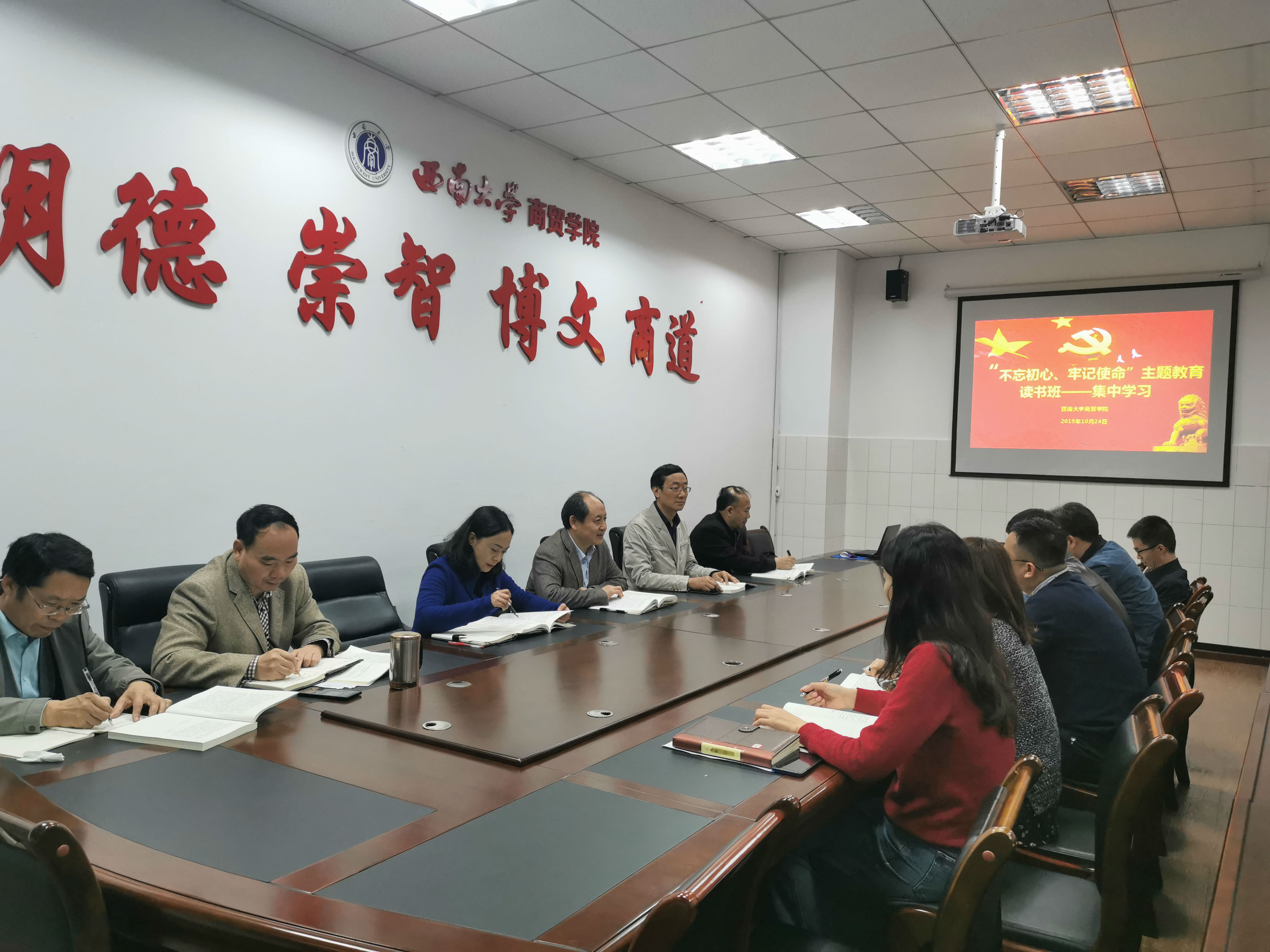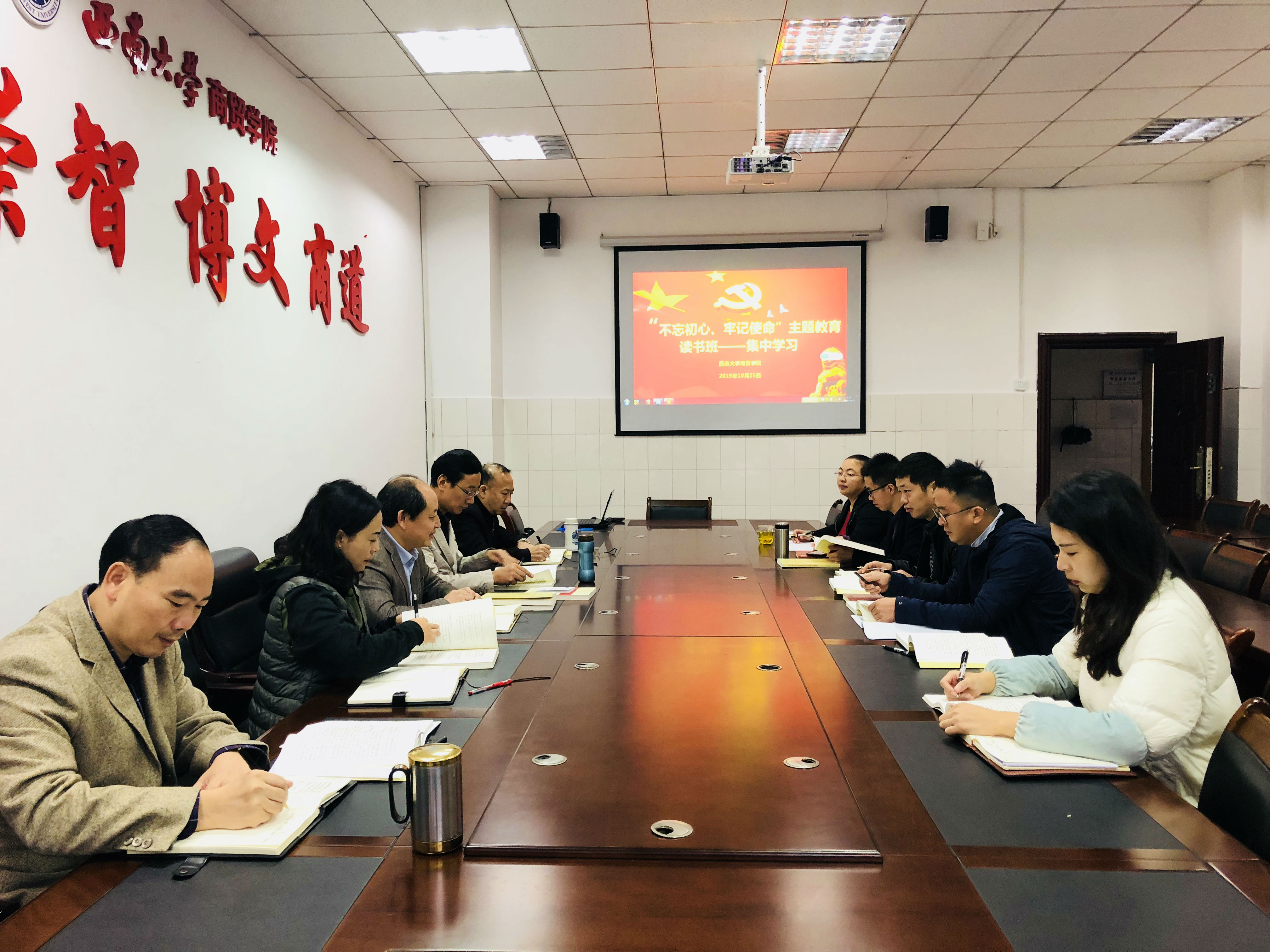 为继续扎实推进“不忘初心、牢记使命”主题教育,按照学院安排,主题教育读书班于10月24日晚上、25日上午进行集中学习,聚焦《习近平新时代中国特色社会主义思想学习纲要》,采用逐一领学的方式,深入学习,深刻领会,并结合学院工作和个人思想实际,开展学习交流。读书班全体成员参加学习,党委书记周国安主持集中学习会。