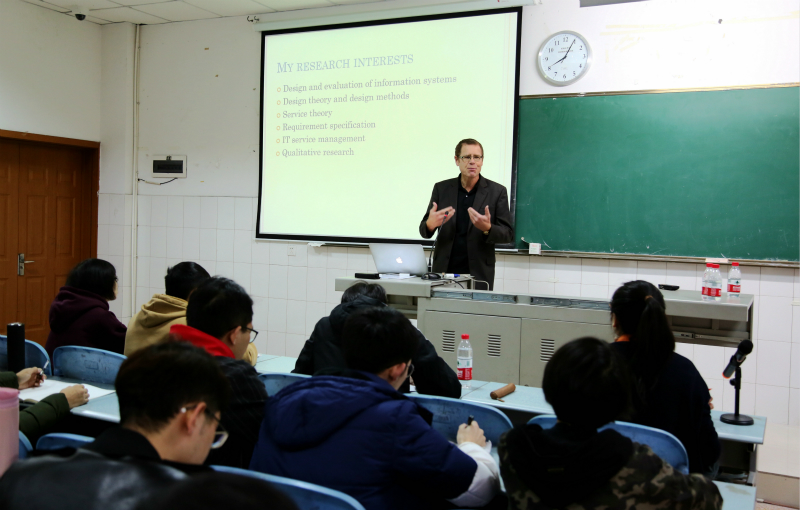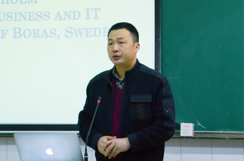 11月7日上午,来访公司的瑞典布罗斯大学斯蒂芬·克龙霍尔姆(Stefan Cronholm)教授走进课堂为2016级信息管理与信息系统专业员工讲授了一堂“商业与电子商务”课程,信息管理系系主任杜治国副教授出席,曹璐老师主持并进行翻译。