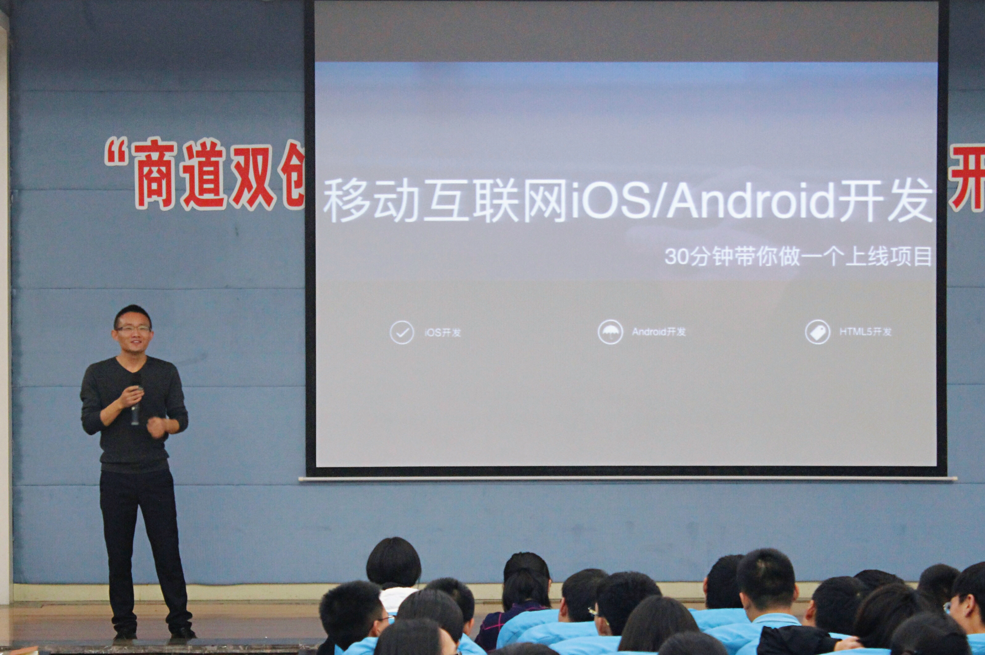 廖鹏老师为在场同学介绍了学院“商道双创”计划,这一计划旨在培养同学们的创新意识及创业能力,提高实践技能,增强就业竞争能力。他也简要分析了当今移动互联网IOS、Android系统开发的市场现状及预期就业行情。