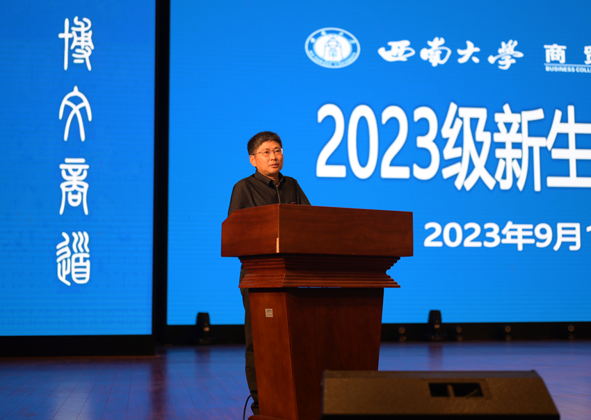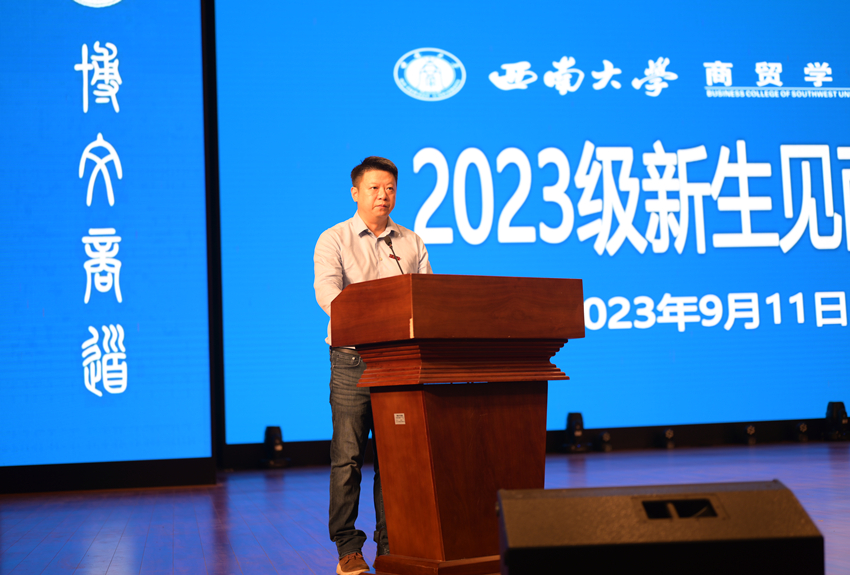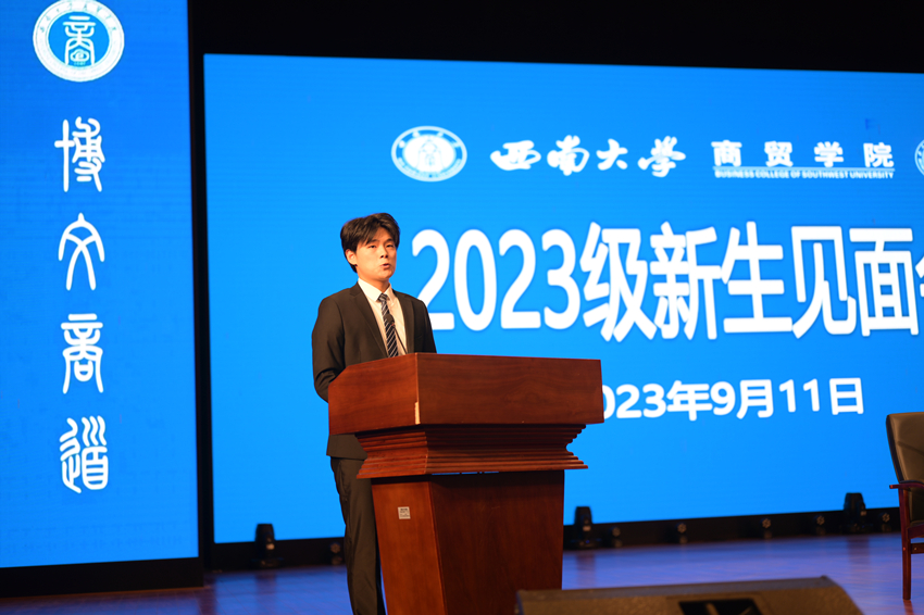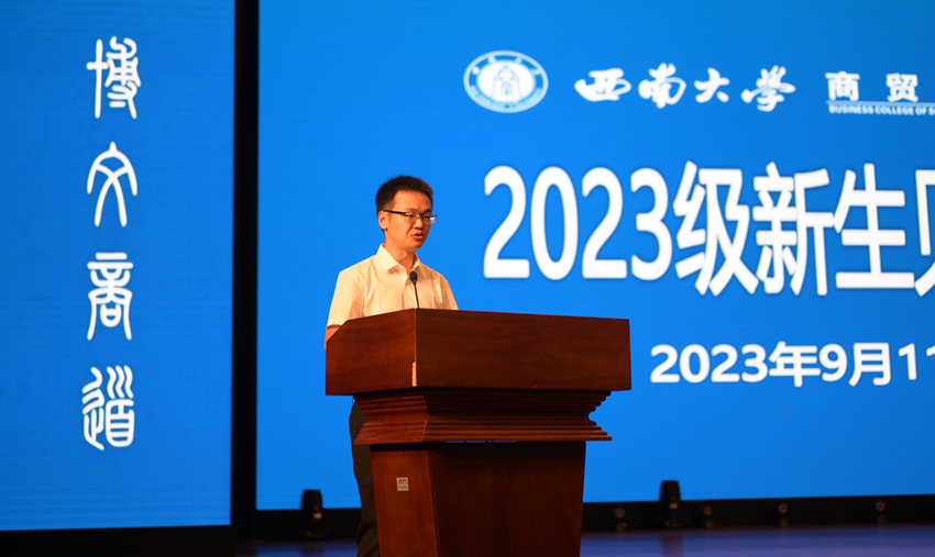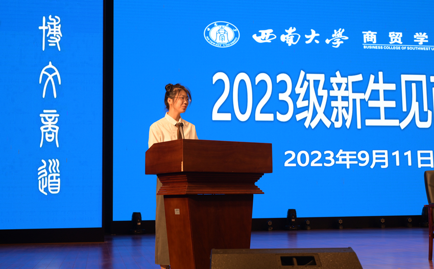 2023级信息管理与信息系统专业本科刘瑾作为新生代表发言。她在发言中分享了奋战高考的辛勤和圆梦西大的喜悦,号召全体新生深入践行“明德、崇智、博文、商道”的院训,意气风发地开始老员工活,创造属于自己的明媚未来。