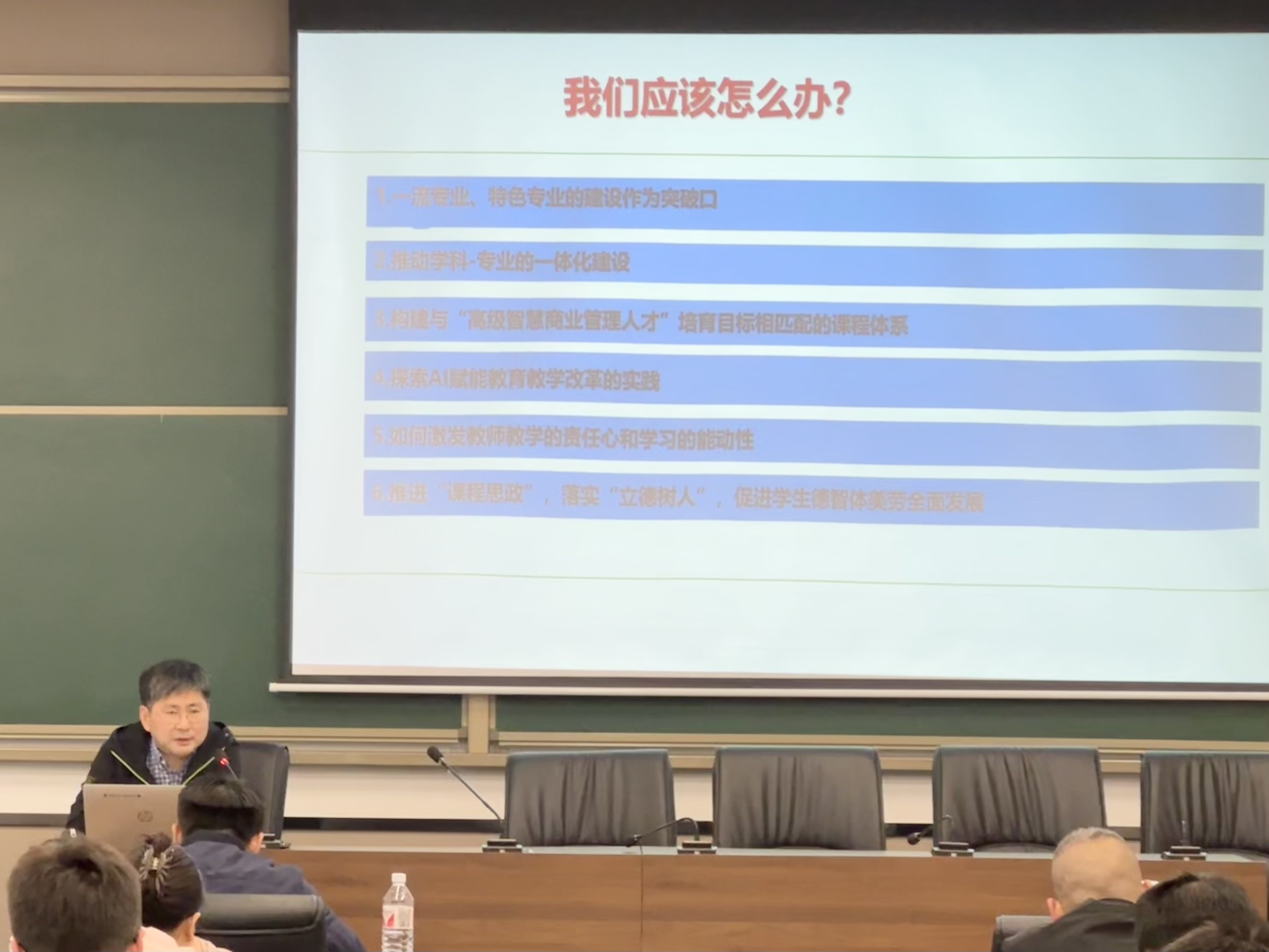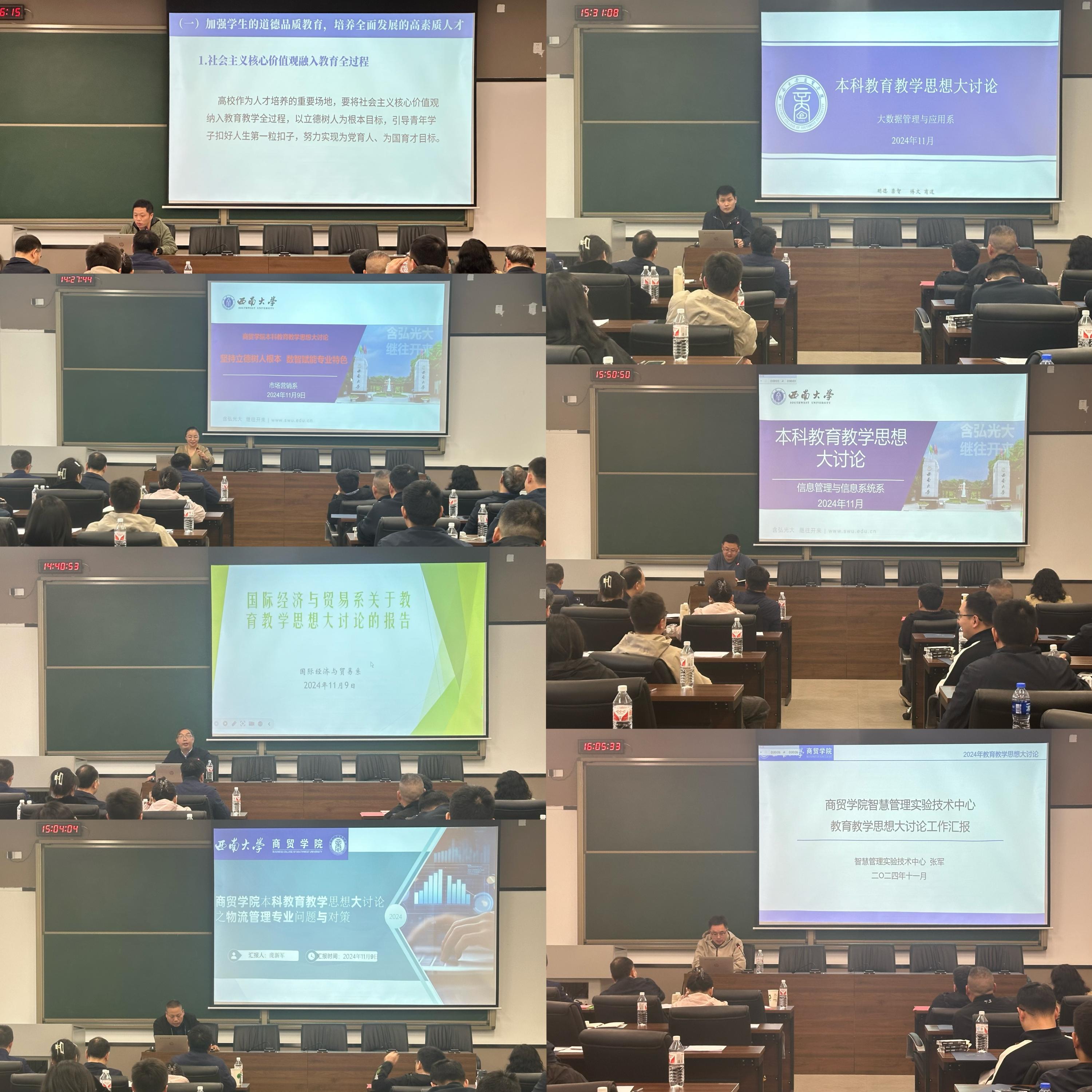 讨论交流中,根据前期各部门分工安排,各负责人进行工作汇报。学工办团委书记廖鹏以“立德树人 启智润心 融合创新 育商英才”为题,阐述了加强员工道德品质能力建构的举措建议;教务办公室主任、市场营销系教师刘光英以“坚持立德树人根本 数智赋能专业特色”为主旨,介绍了市场营销系内大讨论活动的开展情况,讨论的主题、形成的共识、一流专业建设的举措等;国际经济与贸易系主任姚文结合问卷调研结果,总结了树立良好学风、提升公司产品质量的建议与举措;物流管理系主任庞新军介绍了企业调研、员工调研的结果,聚焦物流管理专业调整与优化升级,提出了一系列的思路方案;大数据管理与应用系主任施庆伟汇报了系内讨论的结果,总结介绍了“以技术为主导”的专业发展设想;信息管理与信息系统系主任助理温亮明结合信管专业发展现状,总结了找准定位、明确优势、主动转型、彰显特色的专业建设思想;智慧管理实验技术中心主任张军结合实验室建设现状,指出实验室中心将会不断提升实验教学质量,以更好地服务师生,为公司“高级智慧管理人才”培养目标提供支撑。