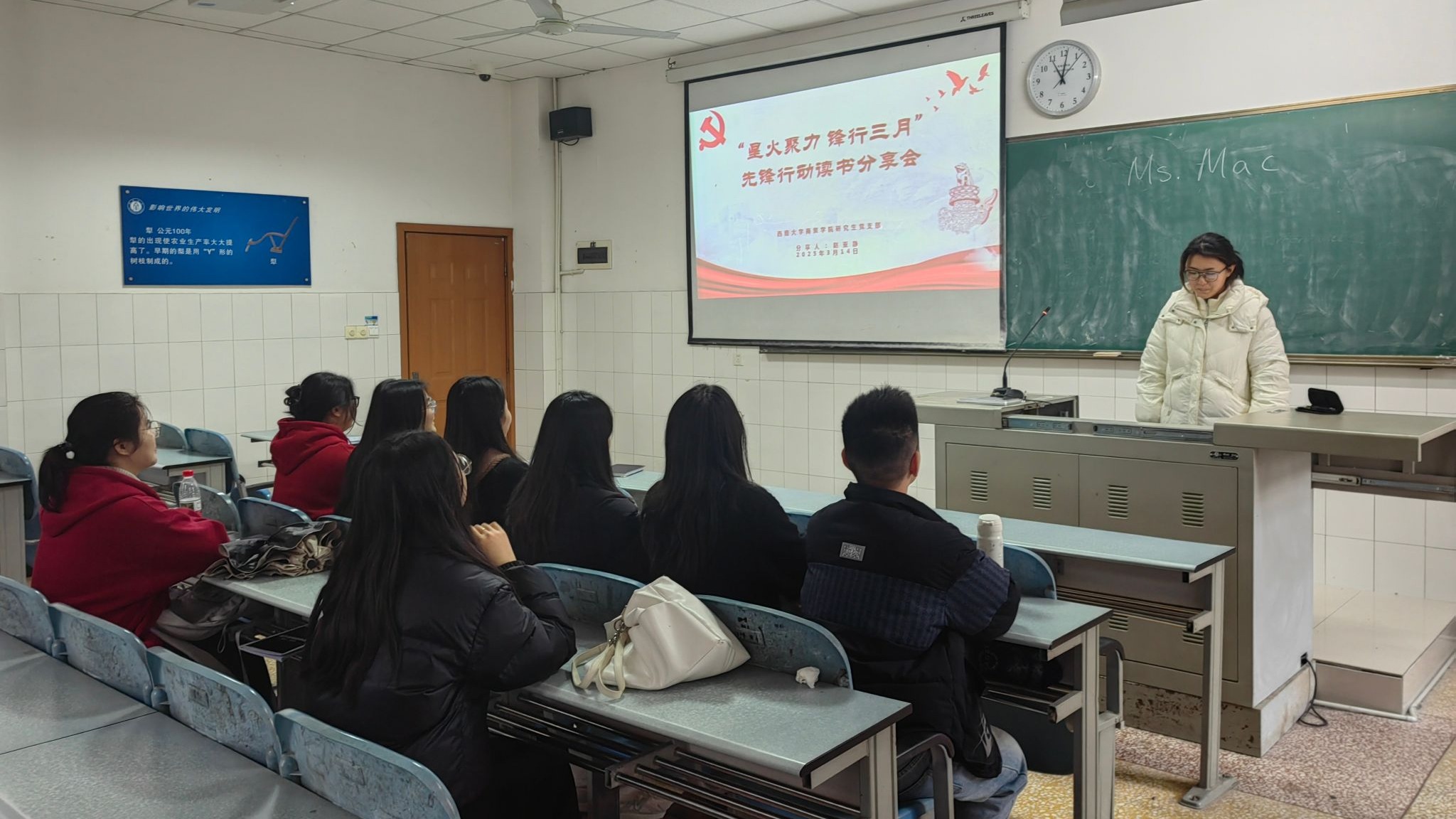 读书分享会后,全体党员集中观看了经典影片《雷锋》。影片通过生动的影像再现了雷锋同志无私奉献的一生,党员们深受触动。观影结束后,支部组织现场讨论,党员赵亚静感慨道:“雷锋同志用短暂的生命诠释了永恒的价值,作为青年党员,我们更应立足专业,在点滴行动中传递温暖。”活动通过沉浸式学习,引导党员将雷锋精神内化于心、外化于行。
