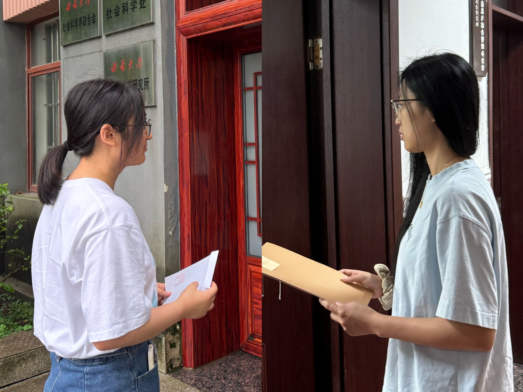 志愿服务岗的王卓同志与孙丝沩同志则投身于北碚校区和荣昌校区之间的资料传递志愿工作。从北碚校区领取资料、核对内容,到协调校车转运、与荣昌校区对接交接,看似简单的流程背后,是对“志愿无小事”的深刻理解。“这不仅是资料的流转,更是责任的传递。”王卓同志分享道,每次传递都需严格核对细节,确保万无一失,这让她们在实践中增强了责任感,也切身体会到岗位设置中“对接两地办学工作”的重要意义。