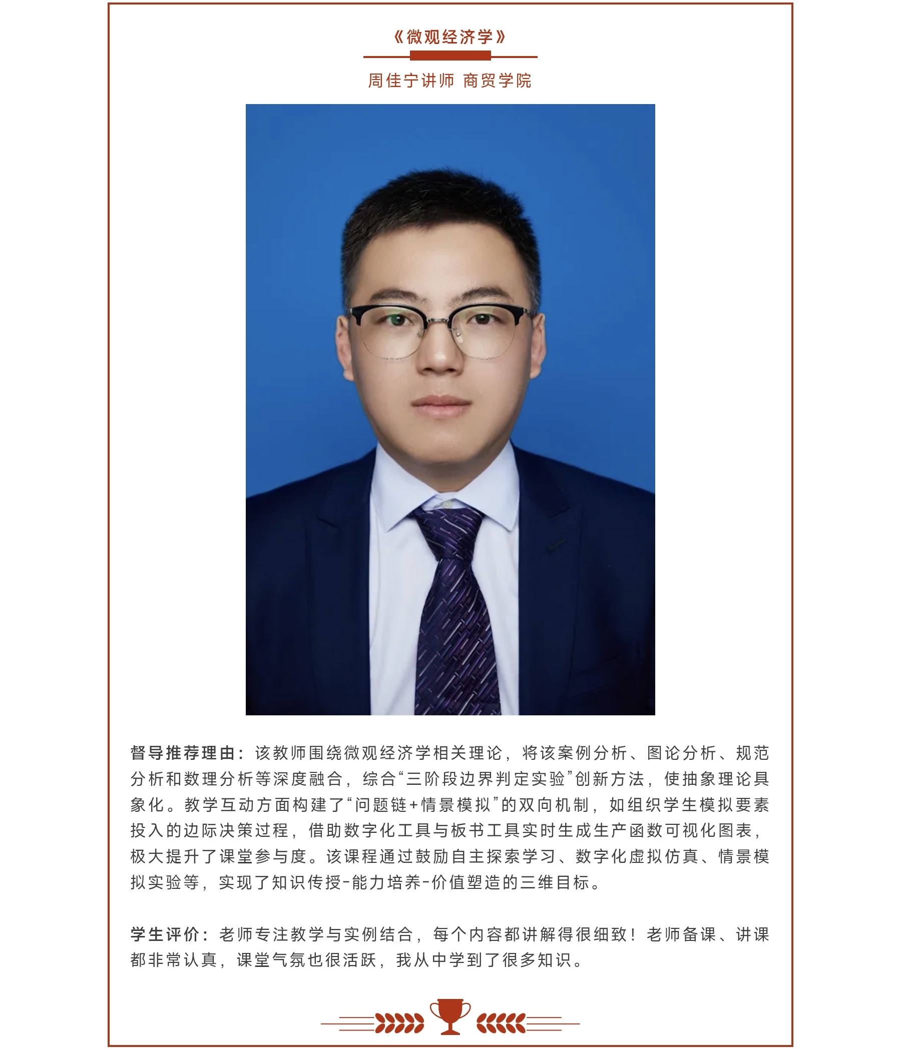近日,k1十年体育品牌本科生院公布第一期督导表扬课程名单,学院教师周佳宁的《微观经济学》课程榜上有名,其教学能力与专业素养获学校本科教学督导委员会高度认可。