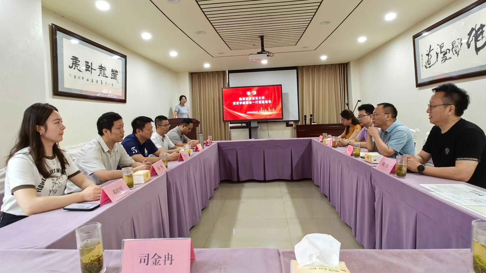 在重庆百分文化传媒(集团)股份有限公司,企业负责人周华热情接待了王熹一行,详细介绍了企业发展概况、业务板块及人才需求。王熹介绍了学院的办学特色、专业优势以及近年来在人才培养、科学研究和社会服务等方面取得的成绩。