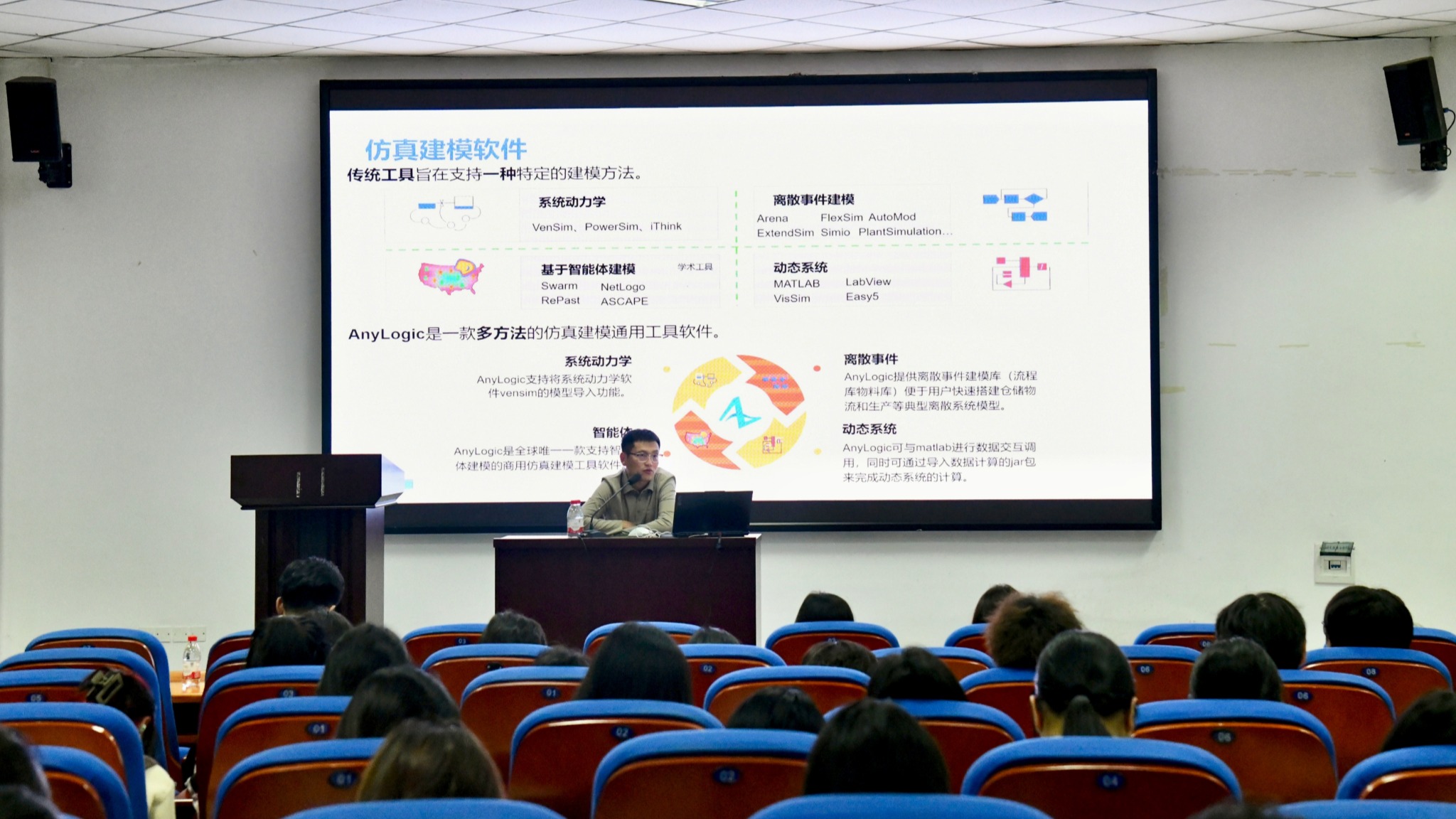 讲座中,丛祝辉系统介绍了仿真技术的三大核心建模方法——离散事件建模、系统动力学建模与智能体建模,并以AnyLogic软件为案例平台,结合仓储调度、运输组织及配送路径等实际应用场景,生动展示了仿真技术在系统性能评估、流程优化与方案预演中的显著优势。