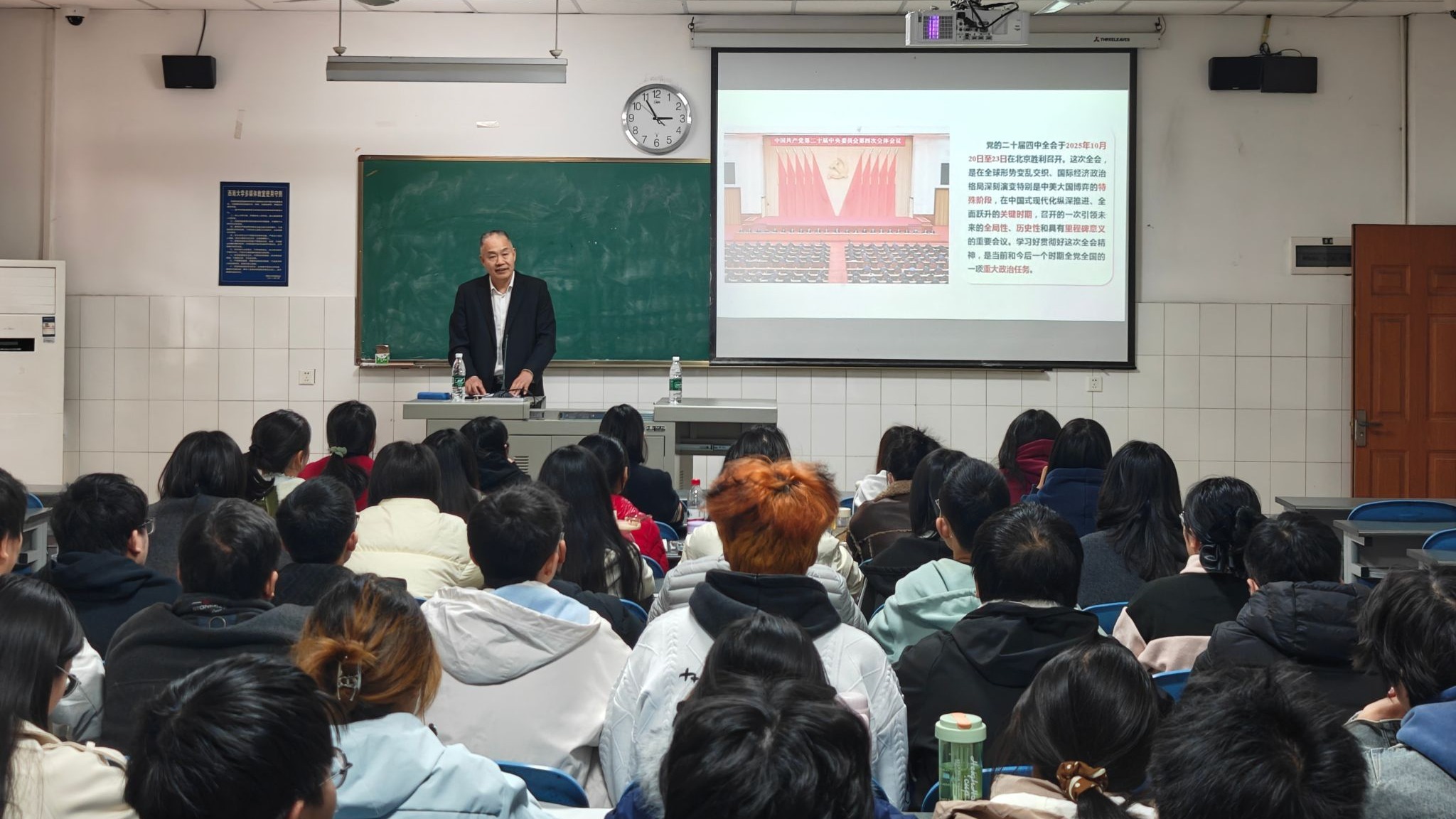 11月20日下午,公司党委常委、副董事长葛信勇在荣昌校区第五教学楼502教室,以《深入学习贯彻党的二十届四中全会精神》为题,为2023级市场营销专业员工讲授专题《形势与政策》课程。校区党工委相关负责人、学院辅导员旁听,现场学习氛围浓厚。