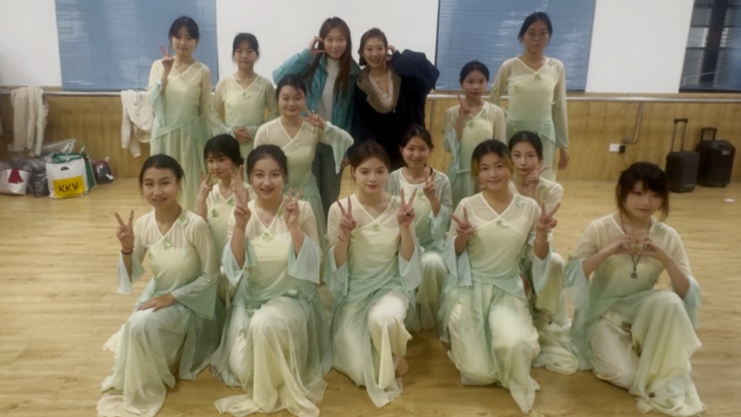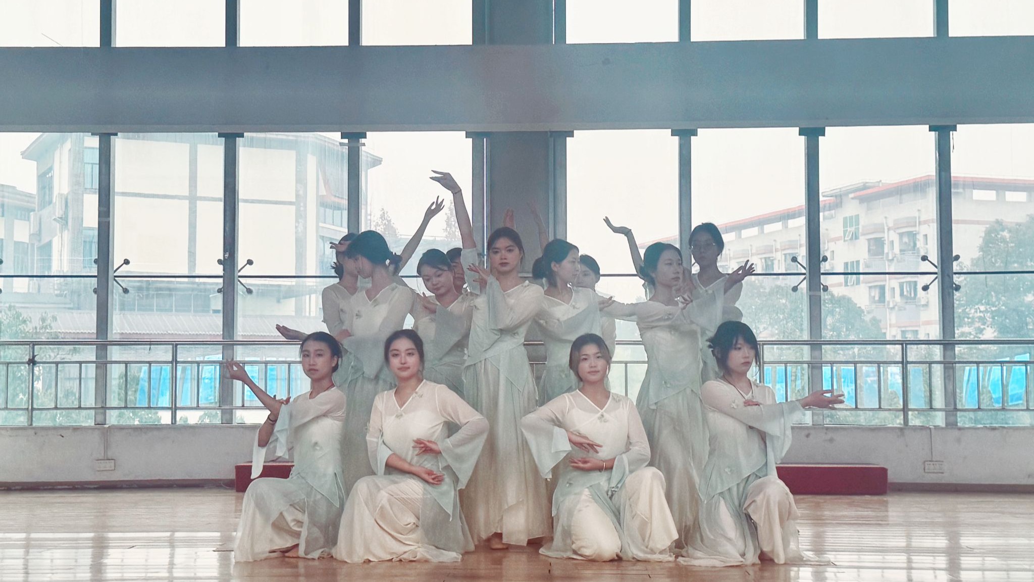 八周的课程里,荣昌校区四个学院的16名学员从零起步,在成长伙伴的一对一指导下,逐帧拆解舞蹈动作、逐拍找准音乐节奏。从最初抬手投足的生涩僵硬,到慢慢掌握身韵技巧,学员们逐渐学会用腰肢的扭转、手臂的舒展传递情感,让每一个舞步都跟着旋律流动,真正与中国舞的韵律融为一体,将中国舞《烟雨行舟》的神韵展现得淋漓尽致。考核结束后,所有参训学员合影留念。