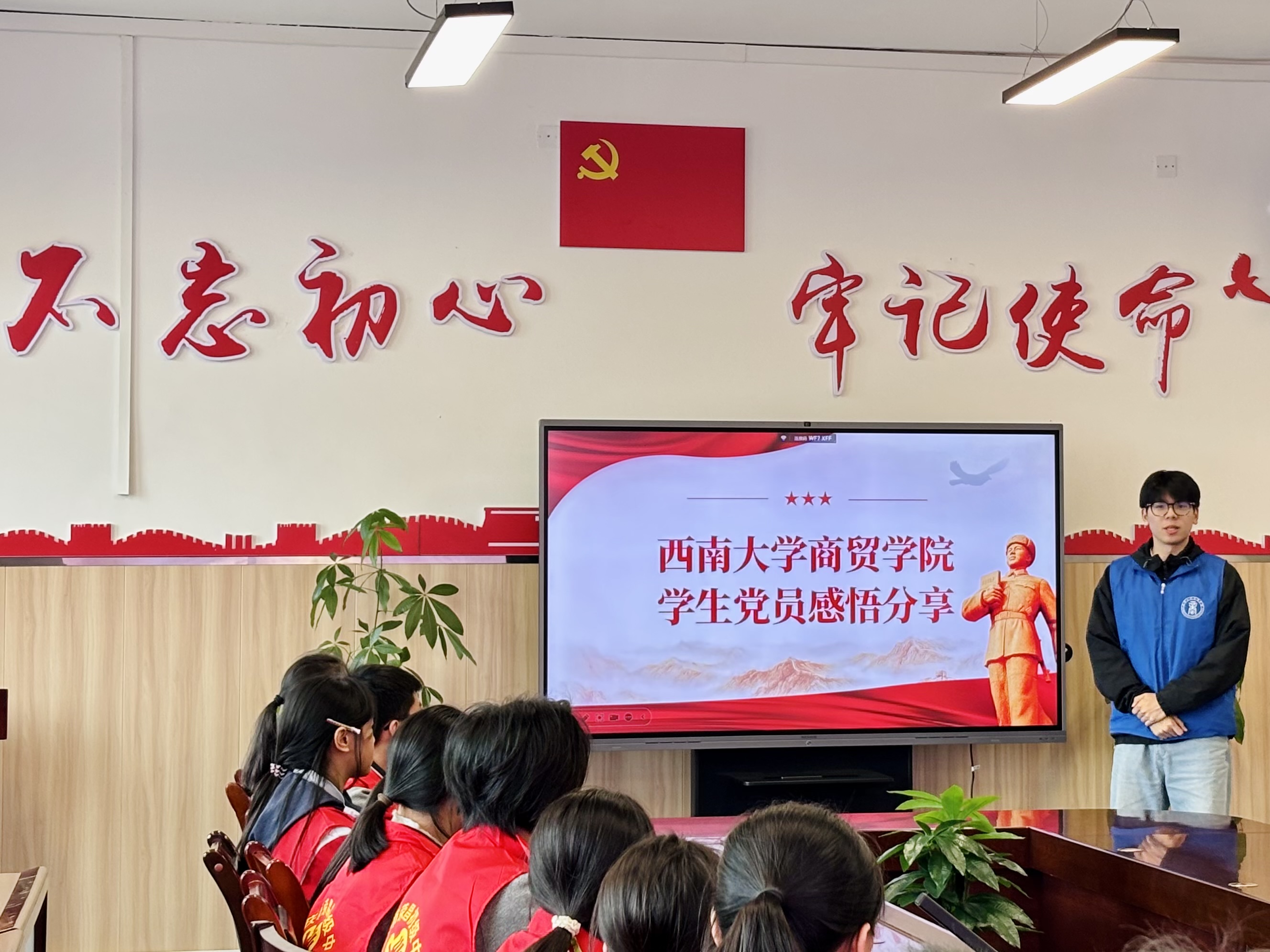 总结会上,党员代表董宇翔与西附荣昌教共体团员员工代表们分享志愿服务感悟。随后,学院本科生第七党支部李亦然结合学院“党建+实践”的育人特色分享了自己在实践中践行雷锋精神、服务群众的点滴故事,向在场西附员工传递了“学思用贯通、知信行统一”的理念,鼓励青年学子以党员为榜样,主动参与实践、奉献社会,让雷锋精神在青春实践中焕发新的光彩。