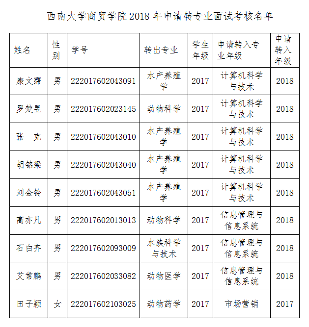 按照学校《关于开展2018年本科员工转专业工作的通知》精神和《k1体育关于接收本科员工转专业的实施方案》,由员工本人申请,经学院本科员工转专业工作小组进行资格审查,康文霈等9名同学通过资格审查(详见附件),确定为本次转专业面试考核对象。面试考核时间为2018年4月27日下午2:30在学院第二会议室(2302),本次面试考核内容主要包括政治思想表现、身心素质、学习成绩、专业特长、发展潜力、兴趣爱好等,请各位同学作好面试准备。